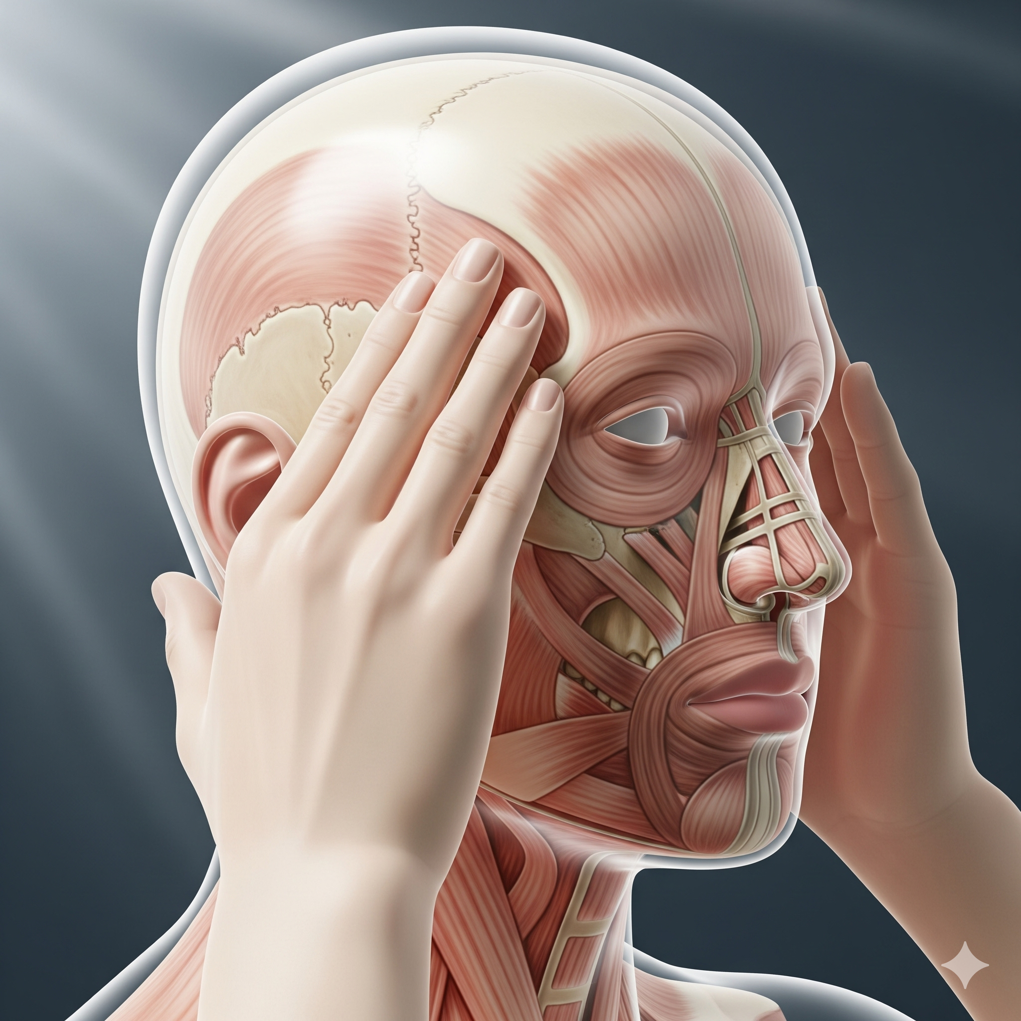 - La première technique est très difficile à faire soi-même et correspond à comprimer assez fortement donc par une tierce personne, le crâne entre les paumes de mains positionnées l’une sur l’espace entre les sourcils et l’autre sur l’arrondi de l’occiput (bosse arrière du crâne).
